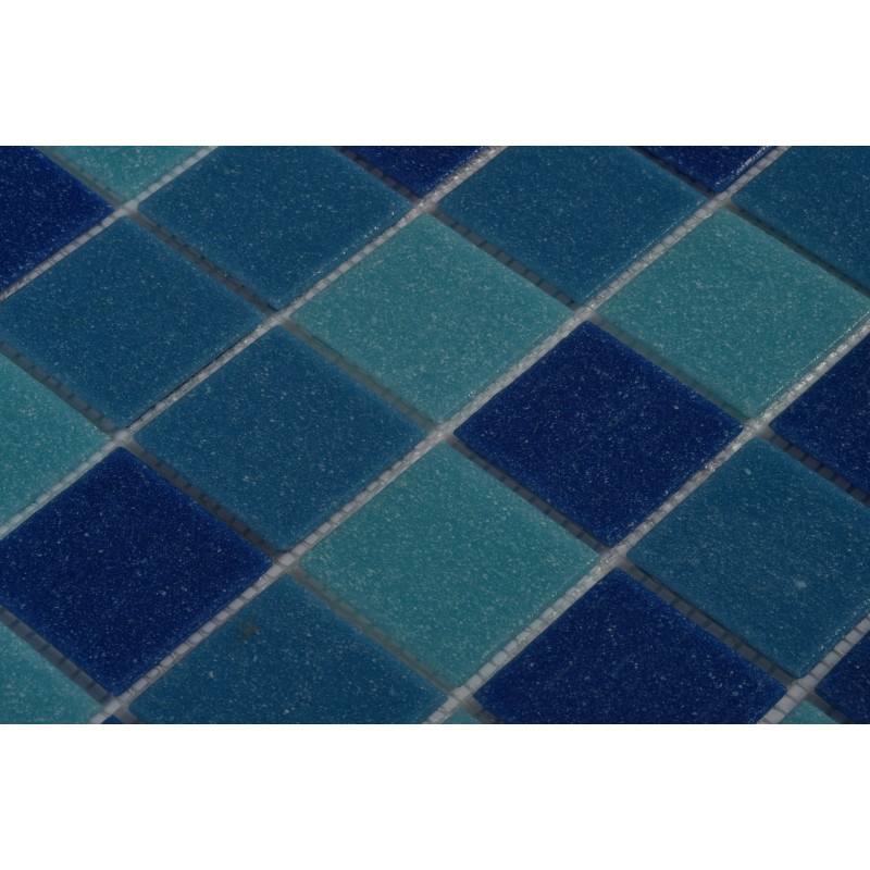 Stakleni mozaik Big Blue u kombinaciji različitih nijansi plave boje. Dimenzija sastavnih delova pločica 50x50mm, dimenzija pločice 315x315mm.